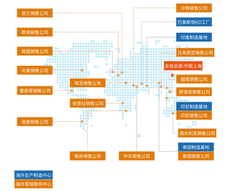 上汽集团现在东北、华东、华南、西南、中南与西北等地区,建设了15个整车基地以及相配套的零部件与物流基地,服务各地用户并有效带动当地经济社会发展。同时,积极参与"一带一路"建设,初步建成集研发、制造、营销、金融、物流等为一体的面向全球市场的汽车产业链,设立了3座整车制造基地和1座KD工厂,产品和服务已进入全球100余个国家及地区。