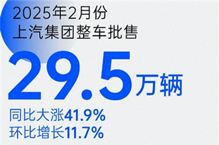 上汽集团2月整车批售29.5万辆 同比增长41.9%